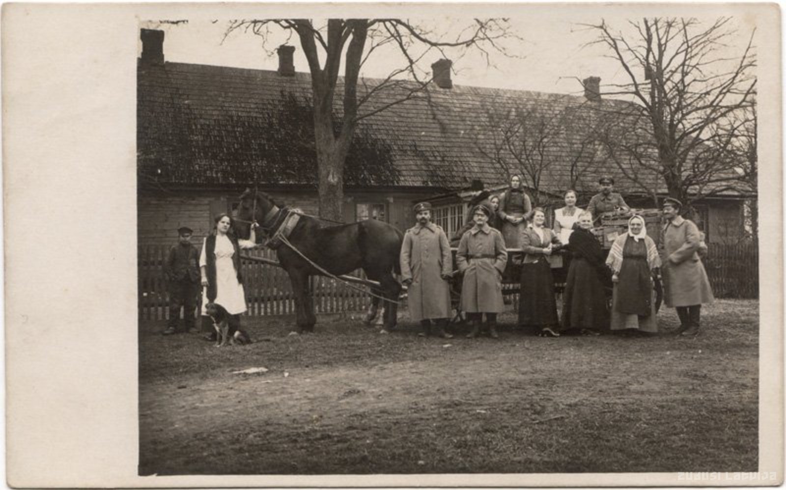 Kalētu pagastā Pirmā pasaules kara laikā. Vācu armijas virsnieki un civiliedzīvotāji pie kādas dzīvojamās ēkas