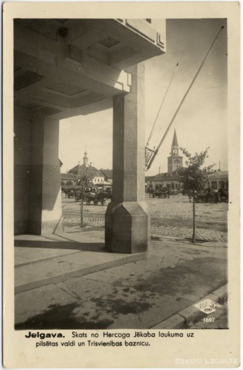 Jelgava. Skats no Hercoga Jēkaba laukuma uz pilsētas valdi un Trīsvienības baznīcu