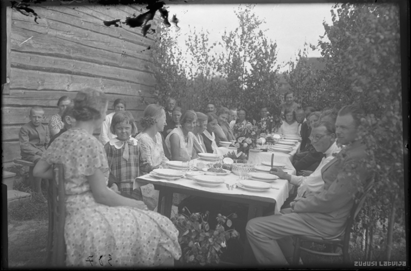Cilvēki sēž pie svinību galda mājas pagalmā