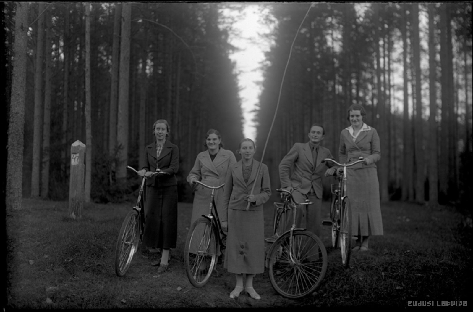 Četras sievietes un vīrietis ar divriteņiem mežā
