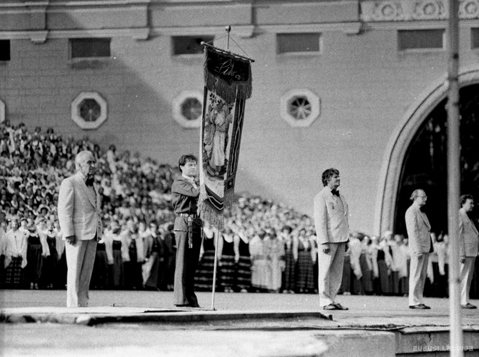 1980.gada jūlijā Rīgā notika astoņpadsmitie Dziesmu svētki un astotie deju svētki pulcējot Mežparka Lielajā estrādē 17425 dziedātājus , stadionā "Daugava'' ap 5000 dejotājus, kā arī aptuveni 2000 pūtēju orķestra muzikantus. Attēlā: Dziesmu svētku virsdiriģenti ar Dziesmu svētku karogu Mežparka estrādē