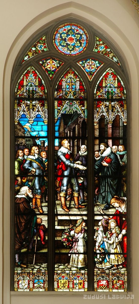 Vitrāža „Superintendents Hermans Samsons sveic Zviedrijas karali Gustavu II Ādolfu 1621. gada 25. septembrī” datēta ar 1885.gadu