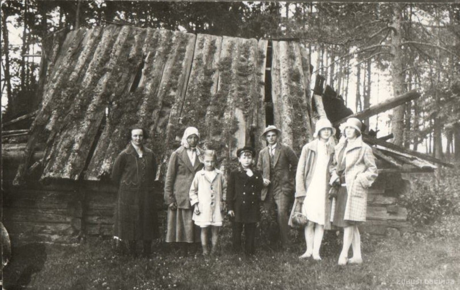 Pie Vadakstes pagasta Priedulas ciema kroga pirts no kreisās: Līda Toms, Līdas māte, Līdas meita Austra, šī uzņēmuma fotogrāfa Narba māsas dēls Pēteris, pats Narbs, Vecauces Liel-Ermaņu meita, Vecauces Kāļu meita