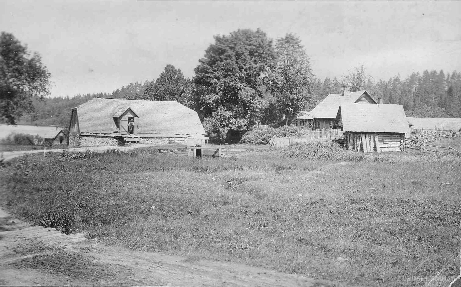 Uz Raipaļa ezera un mežu fona kreisajā pusē „Mišu” māju ūdens dzirnavas, priekšplānā izžuvis dzirnavu dīķis. Labajā pusē pirtiņa un dzīvojamā māja. Dzirnavu ēka sabrukusi 20. gadsimta 60. gados