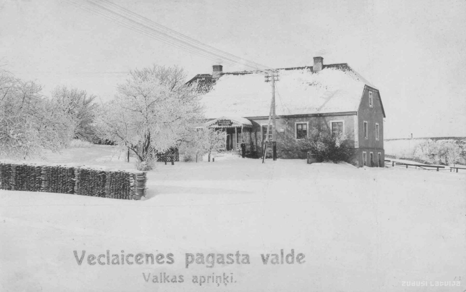 Priekšplānā labajā pusē sniega vārtu grēda, tādas salika šosejas abās malās, lai neaizputina ceļu, un ābeļdārzs. Centrā Veclaicenes pagasta valdes māja ar telefona vadiem un stabu. Pie verandas jumta uzraksts vecajā drukā „Veclaicenes pagasta valde”. Fonā slitas zirgu piesiešanai un pagasta valdes darbinieku dzīvojamās mājas jumts