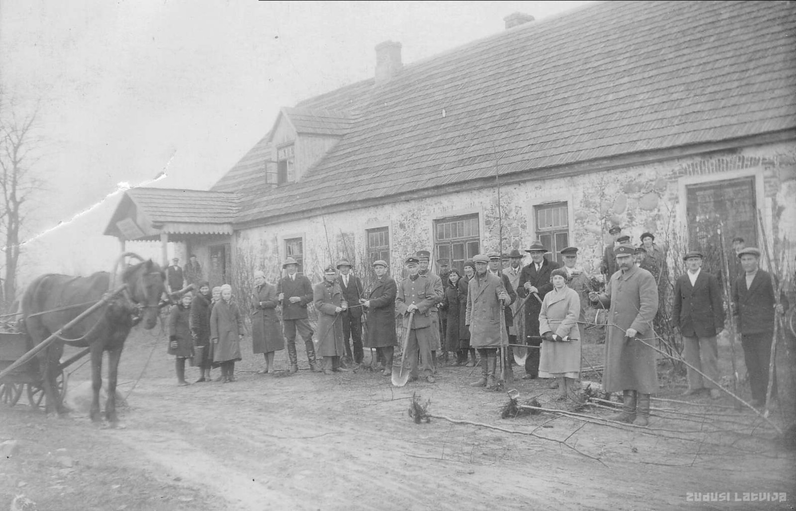 „Mežu dienu” dalībnieki ar koku stādiem un lāpstām pie Korneta vecā Aizsargu nama (bijusī kroga ēka). Kreisajā pusē zirgs ar galdiņu ratiem